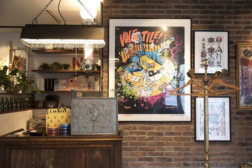 そんなユニークな経歴はショップディスプレイや各種インテリアにも如実に見て取れる。スケートボード、あるいはBMXといった往年のウィールカルチャー、さらにはアメリカンヴィンテージにインスパイアされたアートピースやインダストリアルファニチャーなどを巧みに散りばめつつ、ゆっくりとした時間を堪能できる独自の空間へと昇華。
