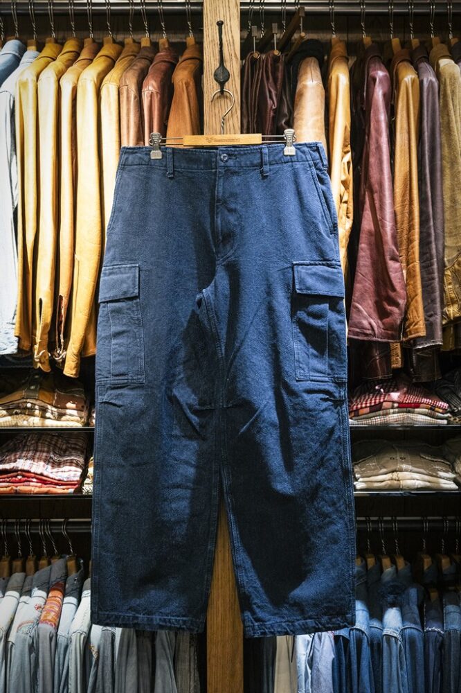 ジャケットと同生地のインディゴ刺し子の生地を使用した6Pパンツ。米軍M51をベースに様々なディテールを盛り込んだ。¥29,700_