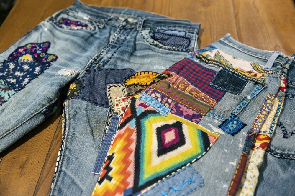 1970年代頃のヴィンテージのLEVI’Sのデニムパンツをカスタムベースに旧いラグや古布を使って独自にカスタムを施した。さらに刺繍ステッチカスタムも上乗せされる。