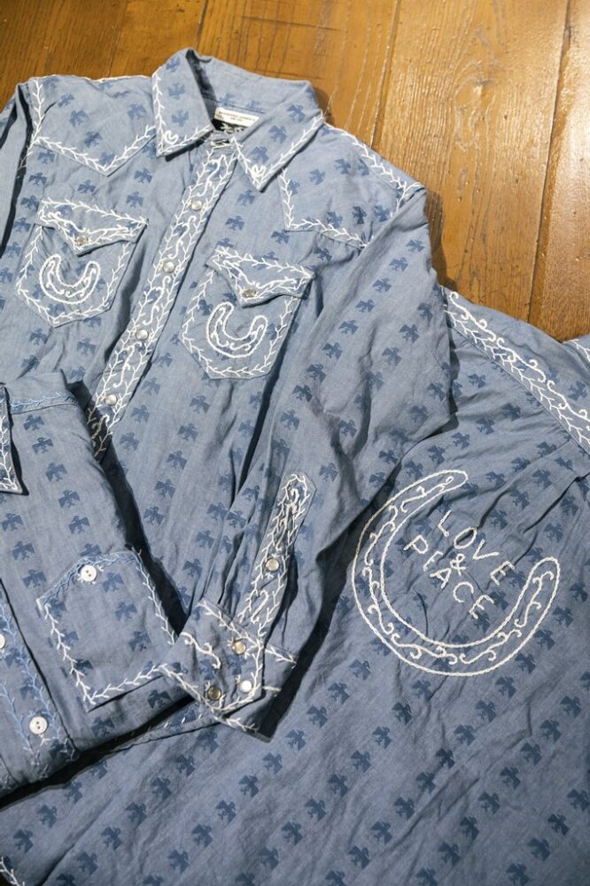 Engineered Garmentsに別注を施したシャンブレーシャツ。サンダーバードからインスパイアされ、よく見るとくちばしの長いハミングバード柄。ボタンダウン、ウエスタン、ワークの3型にセルフ刺繍を施した。