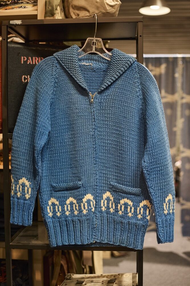 アラスカの文字とともに編み込まれているのはヤギの顔。カウチンセーターの柄は数多あるが、珍しいカラーを発見。