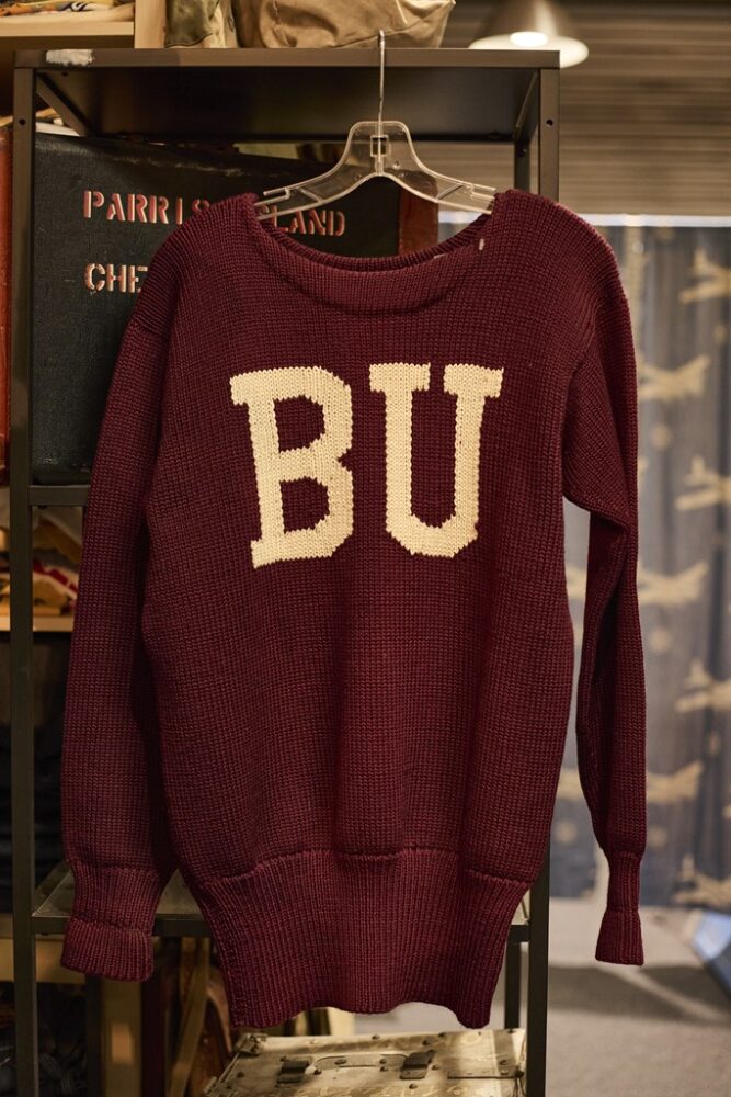 BOSTON UNIV. のイニシャルでBU。文字がフェルトではなく編み込まれているのも希少品だ。襟周りの広いフットボールニットタイプ。
