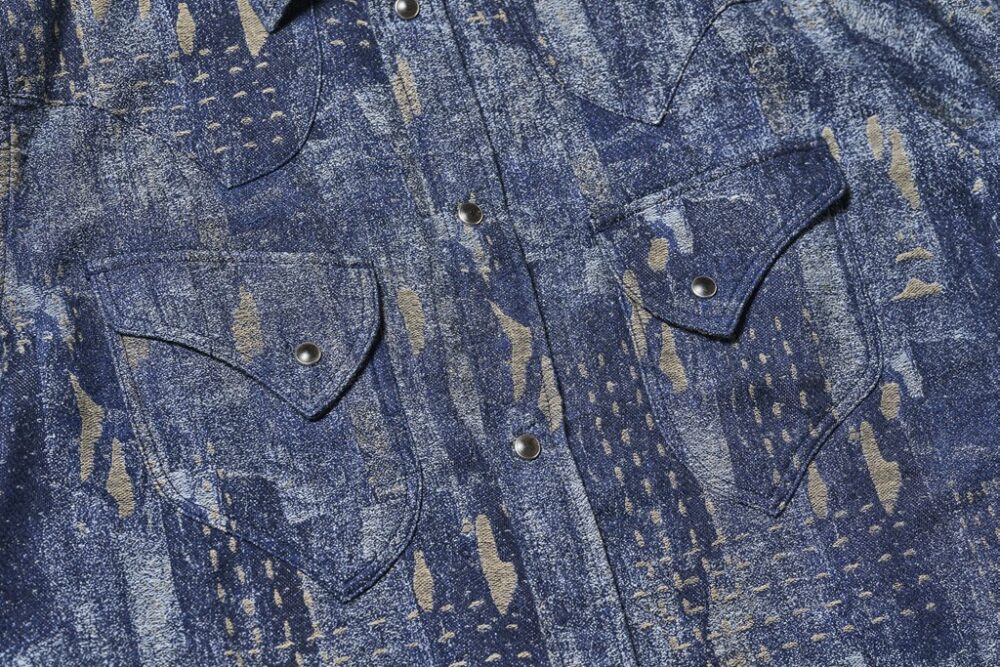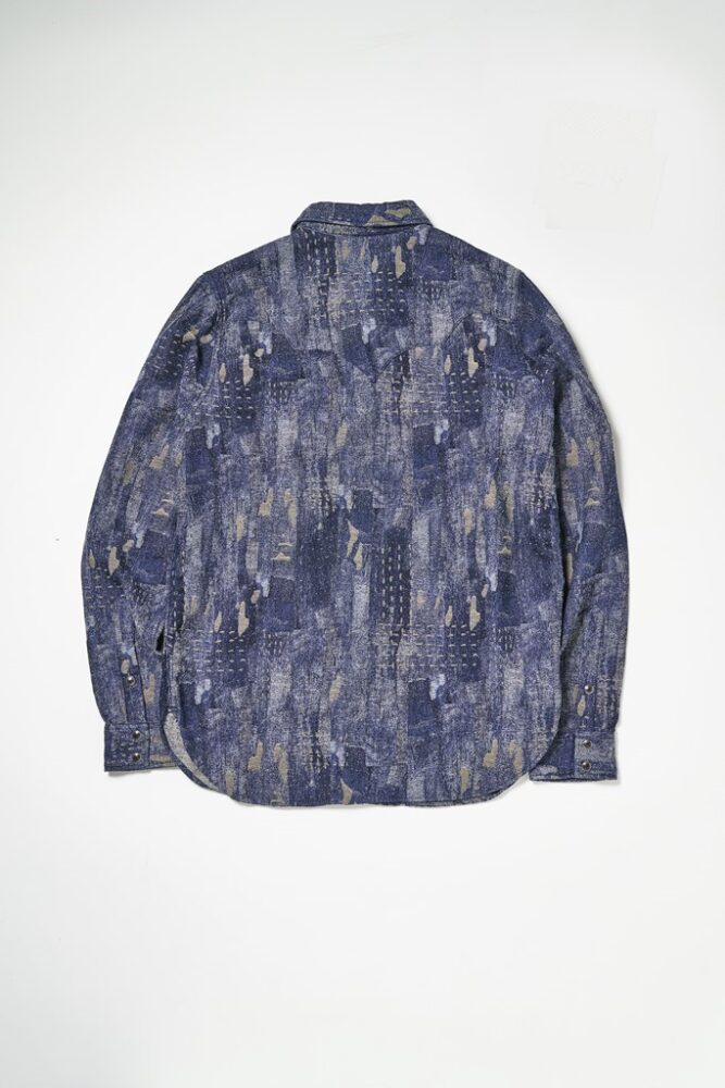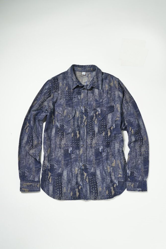 ボロきれをイメージした生地を採用したウエスタンシャツ。曲線的なポケットや、ウエスタンヨークなど、特徴的なディテールを楽しむことができる。¥26,400_