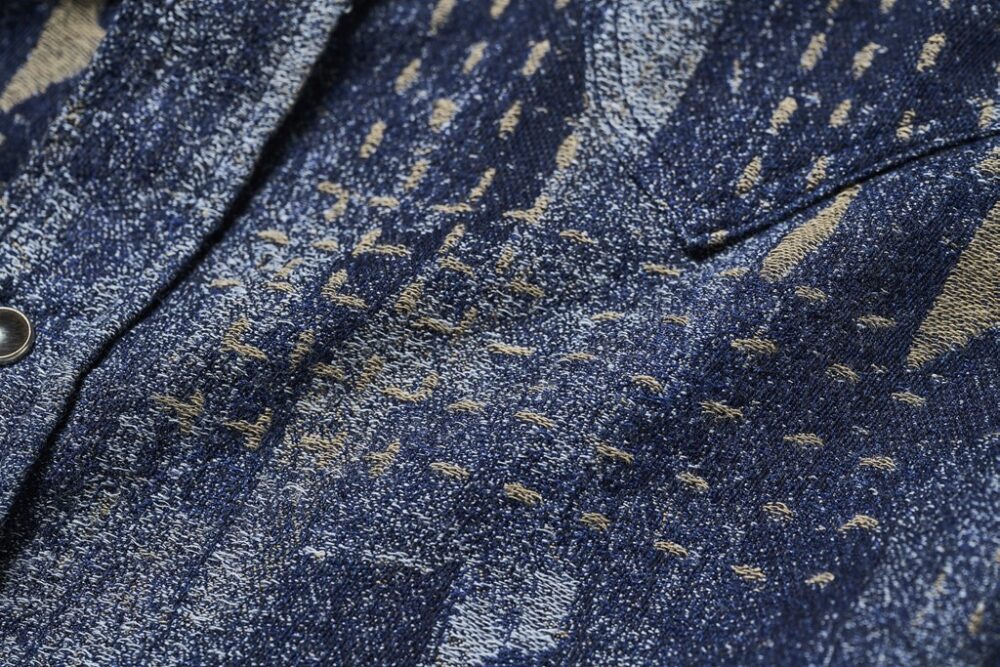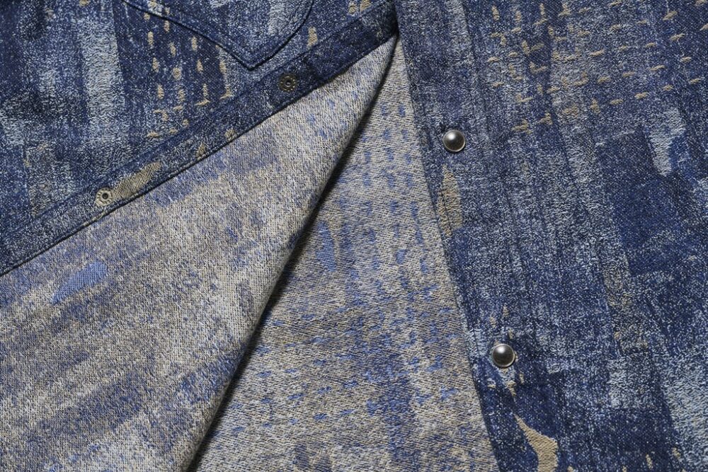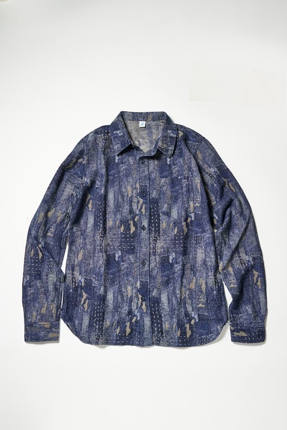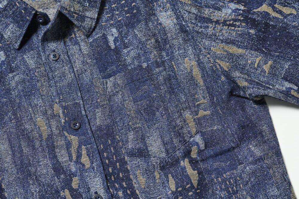 古い布切れを継ぎ合わせたり縫い合わせたりする日本の古布をモチーフにしたデザインが目を引くpure blue japanの新作シャツ。継ぎはぎの雰囲気をジャカード織りで見事に表現している。インディゴでロープ染色した糸と、硫化染めを施した糸を使用して織っているため、着込むほどに色落ちも楽しめる。日本の伝統とファッションが見事に融合した逸品だ。
