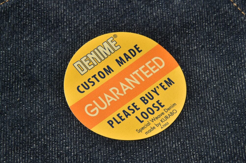 DENIMEと刺繍されたピスネームとバックポケットの縁にある三角ステッチも再現。