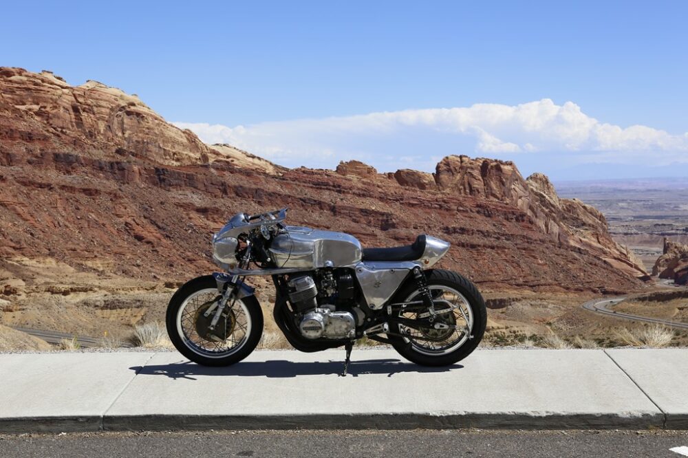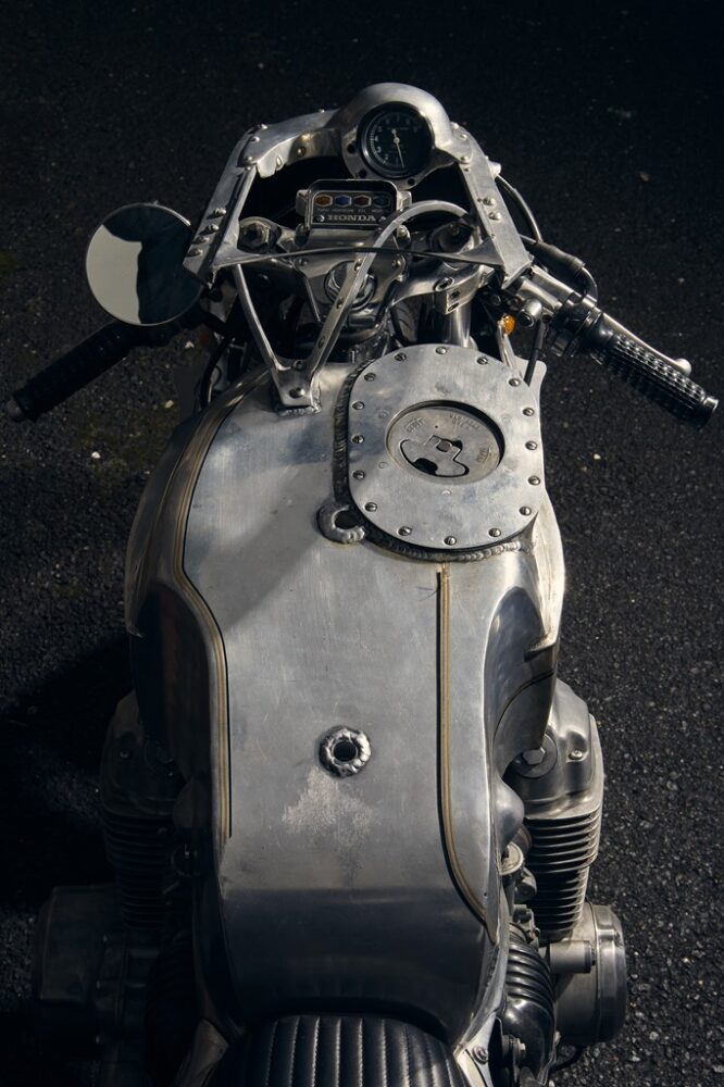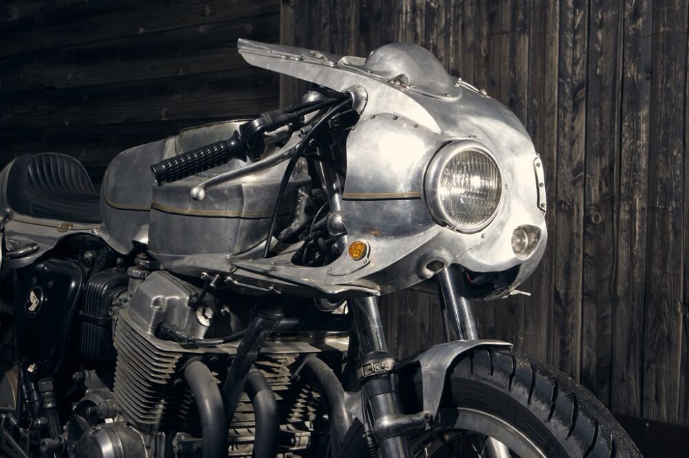 チャボ・エンジニアリングのビルダー、木村信也氏が岡本氏のイメージに合わせて製作したフルカスタム。こちらは大陸横断の往路を担当し、約5000㎞を7日間で完走。木村氏のカスタムはハンドメイドのエクステリアによる外観が注目されがちだが、造形の美しさや存在感だけでなく、リアルに走れるカスタムバイクであることを実証する1台だ。