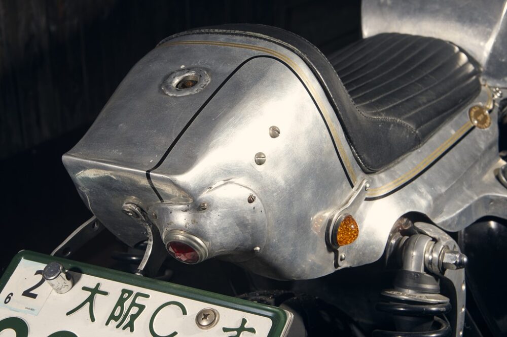 ライダー兼チューナーであるTom Hinesがビルドし、’60年代のヒルクライムレースを爆走していたヒストリカルな1台。元々はシングルギアで、手作りのカムなどが使用されていたが、岡本氏が所有してから公道走行を意識したモディファイが施された。