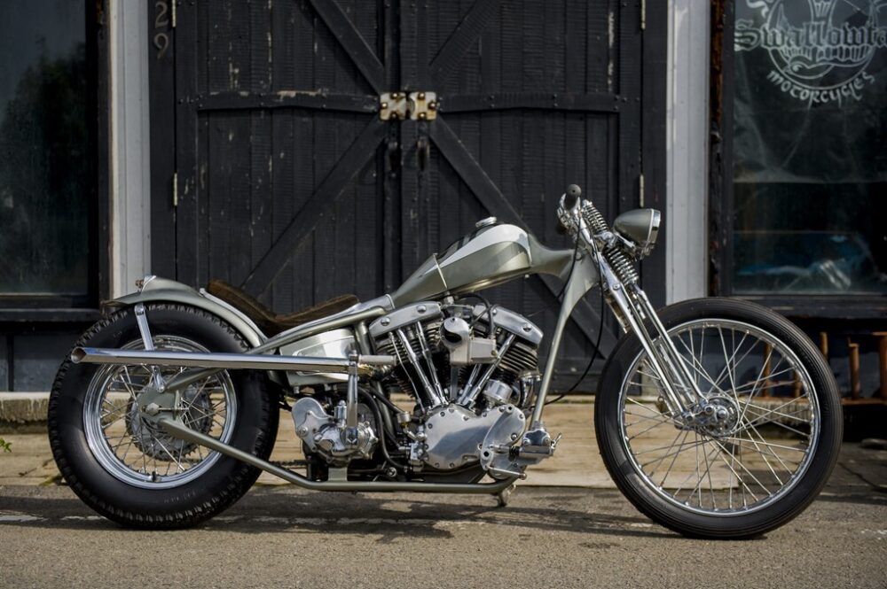 鹿児島スワローテイルがビルドしたフルスクラッチは、岡本氏の生まれ年である1965年パンショベルをベースに、チョッパーとドラッグレーサーのDNAを融合させた1台。スクープドタンクの造形など、チョッパービルダーDean Lanzaのカスタムを意識した意匠が見られる。