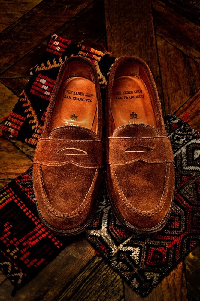 サンフランシスコにあるAlden直営店で2010年に購入しました。通常、アメリカ国内のブランドやショップは、サイズ7~の展開が普通なので、もう1サイズ小さい自分は、本国アメリカでの購入は諦めていたのですが、直営店で奇跡の出会いを果たしたのがこのペニーローファーです。アッパーがスウェードのローファーなので、カジュアルでの着用はもちろんですが、展示会など、少しかしこまったシチュエーションの際に好んで着用していました。どんなスタイルでもコーディネイトしやすいアッパーのダークブラウンもお気に入りです。