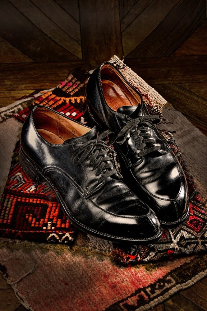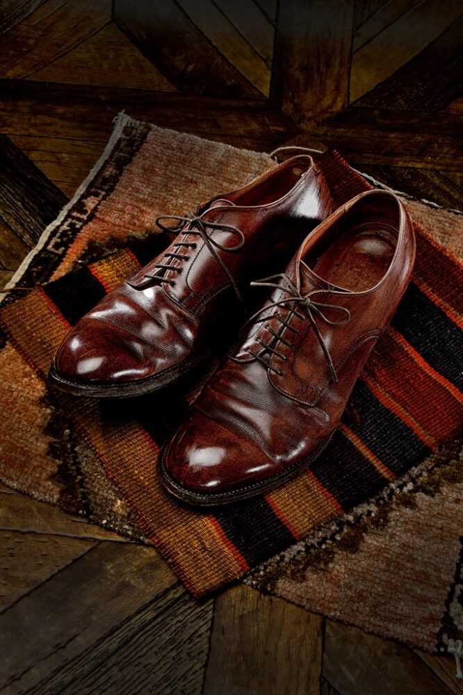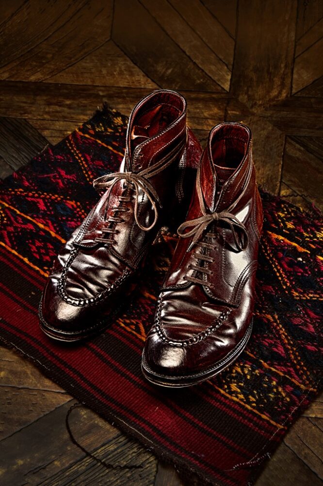 セレクトショップでアルバイトをしていた学生の頃、先輩から譲っていただいて以来、履き心地の良さと美しさから魅力にハマり、ずっと愛用し続けています。なかでもこのウィスキーコードバンは、長年探し続けても見つけられなかったシューズで、数年ほど前にアメリカに行った際、たまたま出会って即購入した想い入れの強い1足です。サイズ選びは特に重要で、自分の足型とハーフサイズ異なるだけで履き心地もだいぶ変わります。このチャッカはぴったりなマイサイズ。パンツの裾をロールアップしてハイトを見せて履くのも好きですね。
