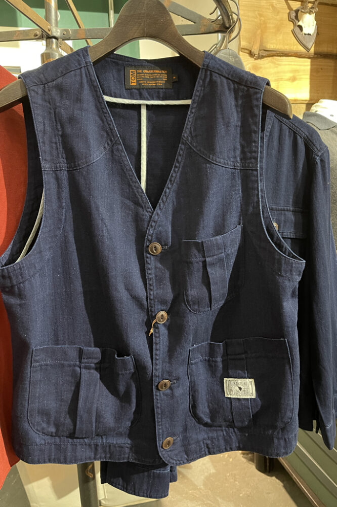 今回のクラッチカフェには、生産が間に合わなかったので、彼らのシグネチャーでもあるカラフルなシャツやジャケットはなかったものの、インディゴのベストや、それにセットアップできるジャケットなどがあります。 ベストはTシャツの上に羽織ったり、寒いときには重ね着ができたりと、オシャレ度アップのアイテムですね。