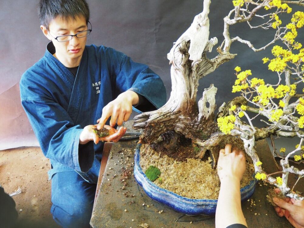 多賀谷氏のクルマの荷室から運び出されたのは蕾がほころび始めた盆栽だった。