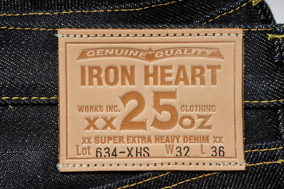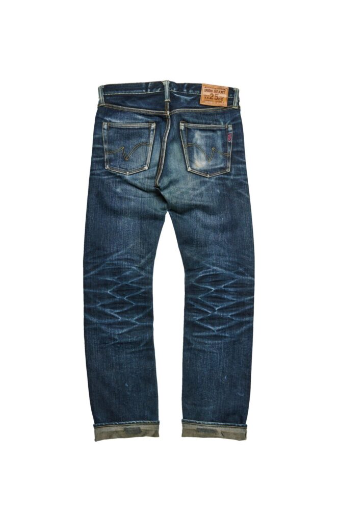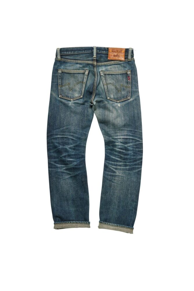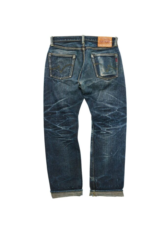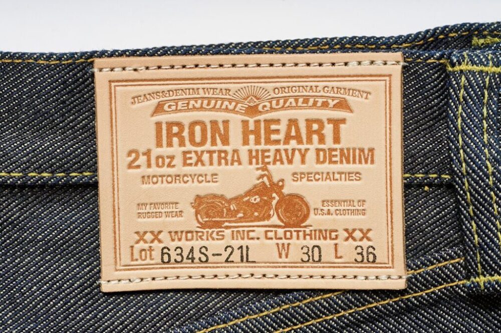 生地の厚みによって股や膝裏などに刻まれる皺が太くなるため、力強いアタリが出て、ヘビーオンス特有の色気を醸し出す。それはバイク乗りだけをターゲットにしたものではなく、デニムファンにとっても魅力的なIRON HEARTの個性として支持されている。