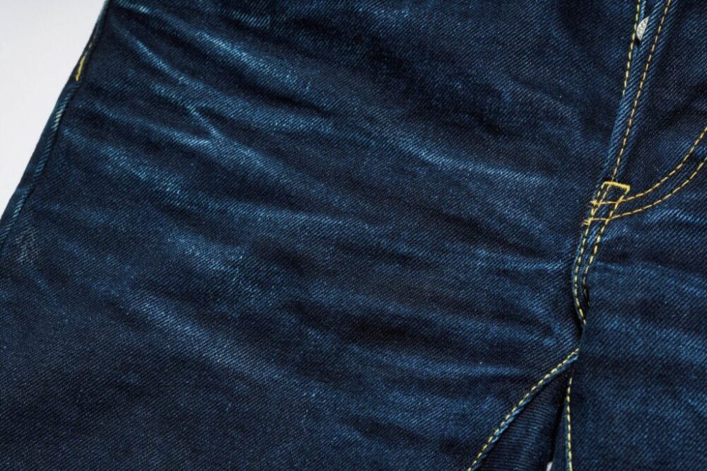 左綾デニムは生地のコシ感とメリハリの強いタテ落ちが特徴だ。