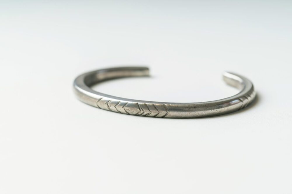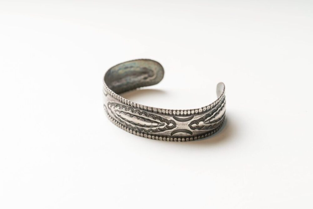 1910年代頃~30年代のバングルで、インゴットシルバー製法や力強いスタンプ、リポーズなどナバホの伝統的な技術が詰まったアンティーク作品となっている。
