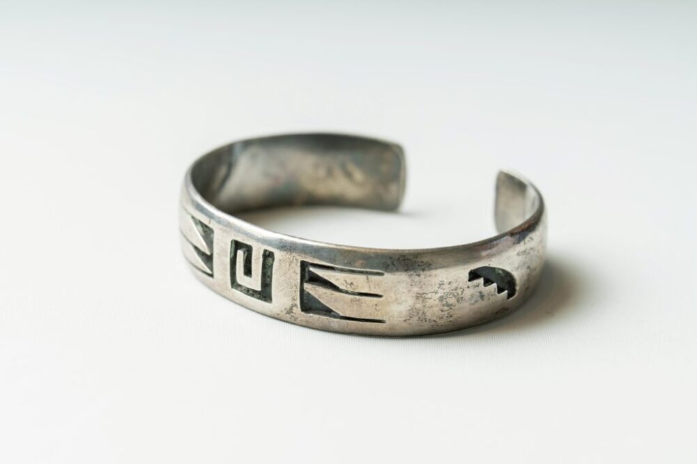 ホピ族が得意とするオーバーレイの初期作品。かなり厚いシルバーを用いているのがおもしろい。GI Bill(復員軍人援護法)などの彫金クラスで教材として作られた可能性も。