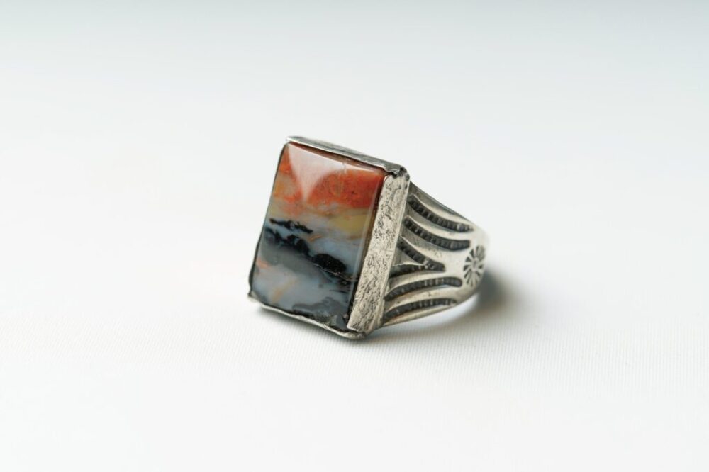 ナバホの巨匠アンブローズ・ローアンホース(1904-1982) を兄に持つ作家サム・ローアンホース(1915or1916-1983)の作品。ペトリファイドウッドを用いた個性的なリングである。