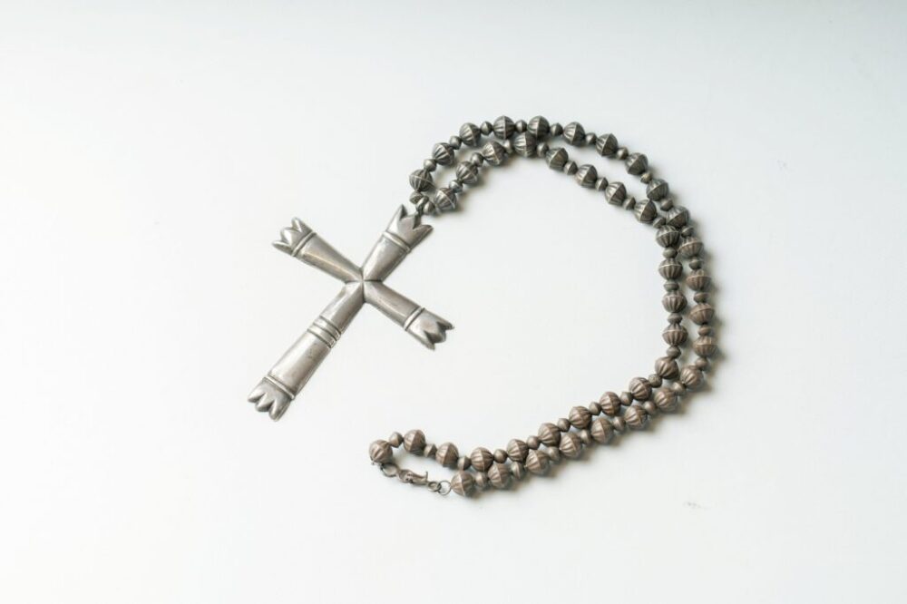サンドキャストで成形された造形の美しいクロストップと、ハンドメイドのナバホパールで構成されたネックレスは、ナバホの巨匠を兄に持つアンブローズ・リンカーン(1917-1989)の作品。