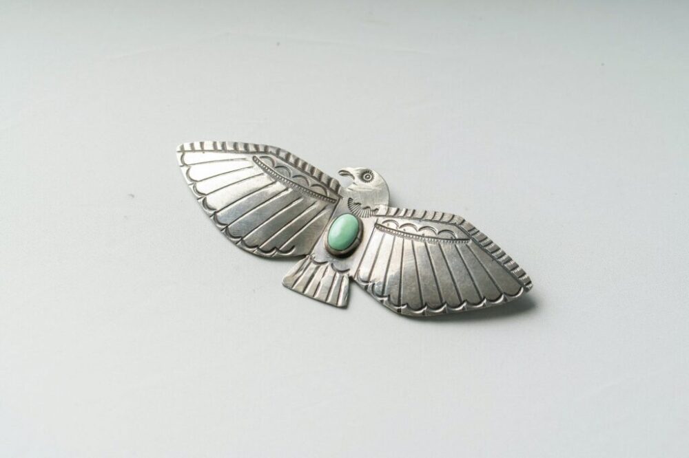 ネイティブアメリカンの神聖なモチーフのひとつであるサンダーバードのピンズ。アローヘッドをモチーフとしたホールマークが入るが作者は不明。この作家による作品を他にも確認。