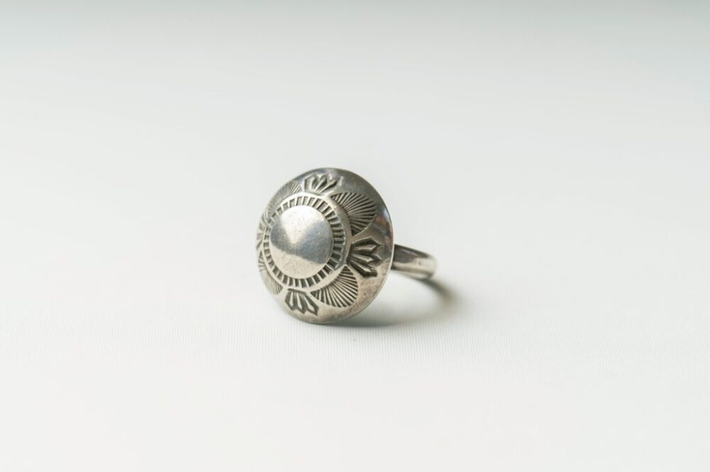 ナバホジュエリーの古典期にあたるコンチョ。プリミティブながらも重厚感のあるデザインで、今も受け継がれている伝統的な技法が駆使されている、歴史的価値のある作品と言えるだろう。