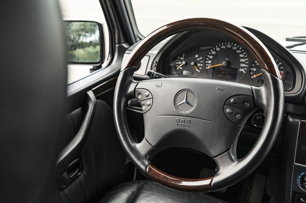 視界良好なGクラスの運転席。ハンドルはウッドとレザーのコンビネーションが高級感を漂わせる。