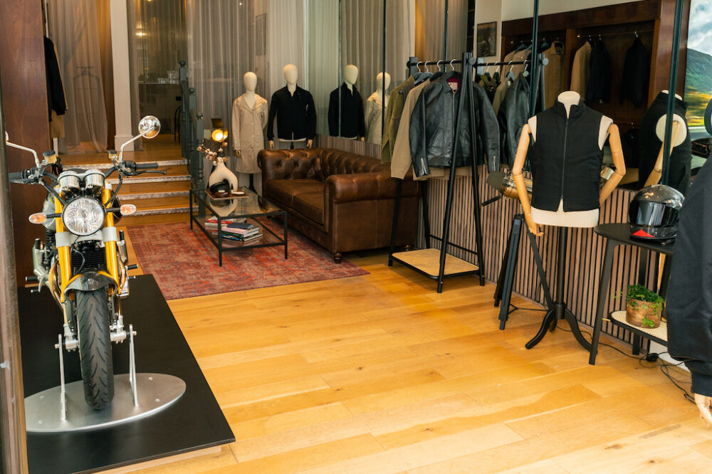 また、今回このイベントに行ってきた理由のひとつとして、クラッチカフェでは、ノートンモーターサイクル社(ノートンというブランドのテーラーもあるのですが、別会社だそうです!)とコラボをしているからなんです。イベント会場と同じサヴィル・ロウにオープンしたノートンのポップアップショップに、バイクに合うようなスタイリングが組めるよう、いくつかクラッチカフェからキュレーションをした商品を提案しております。