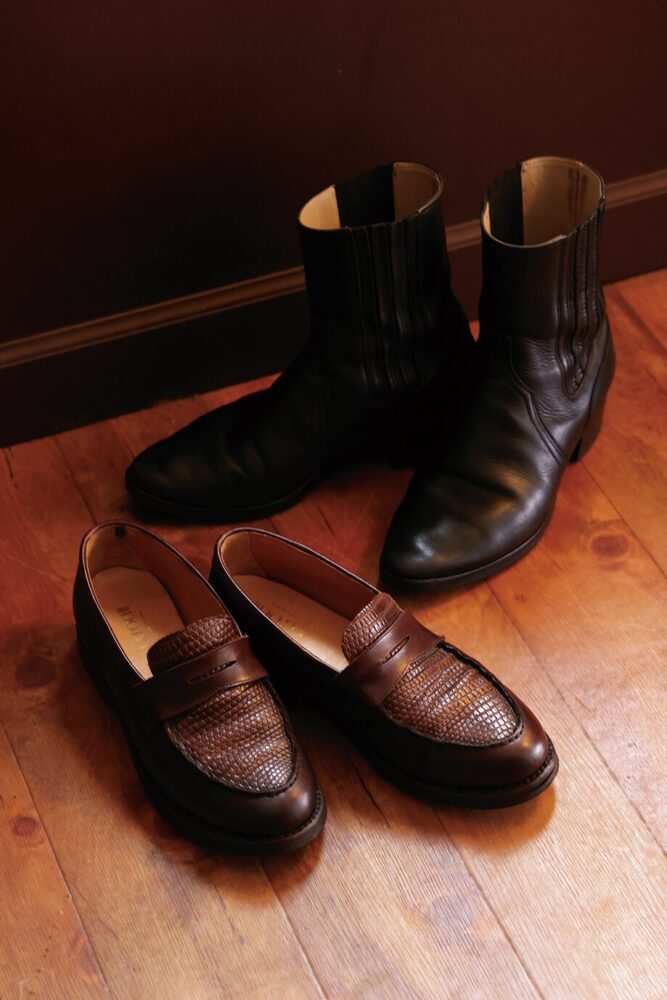自身がデザインするLA POCHEのシューズ。リザードコンビのローファーと1番最初にデザインしたサイドゴアのウエスタンブーツ。