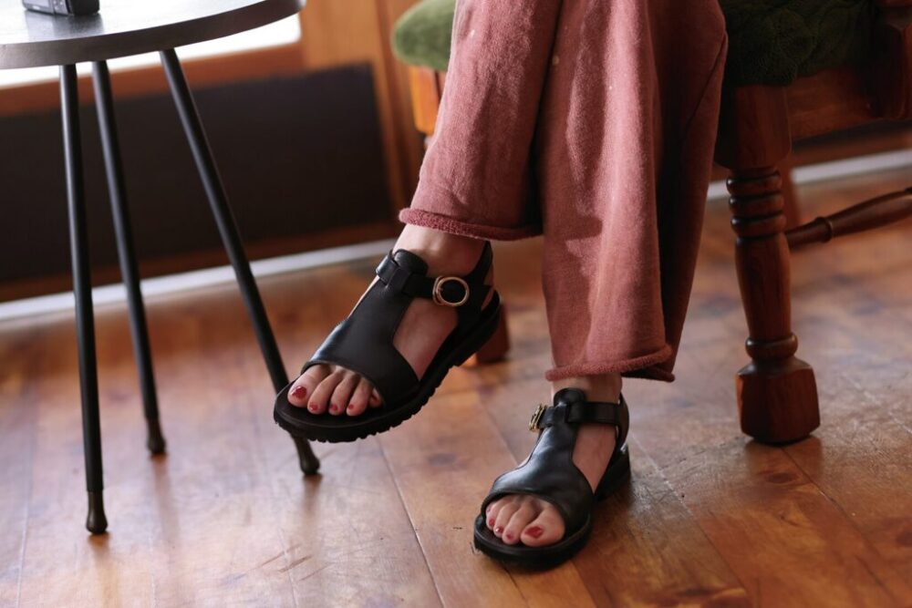 昨年から定番入りしたサンダル。あまりレザーシューズ慣れしていない女性のために履きやすいように改良を加えたモデル。