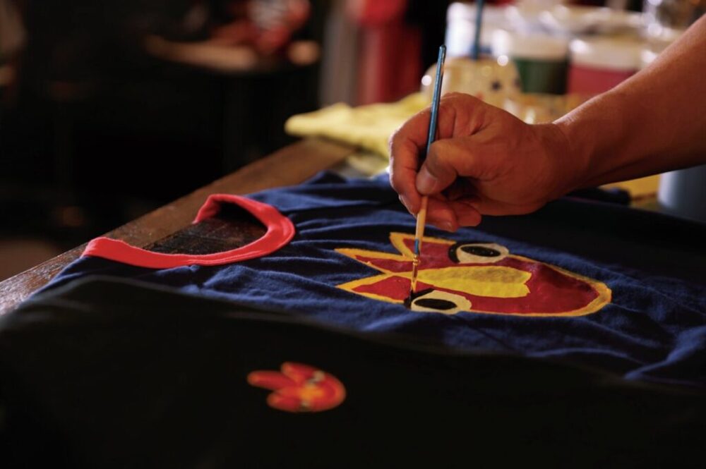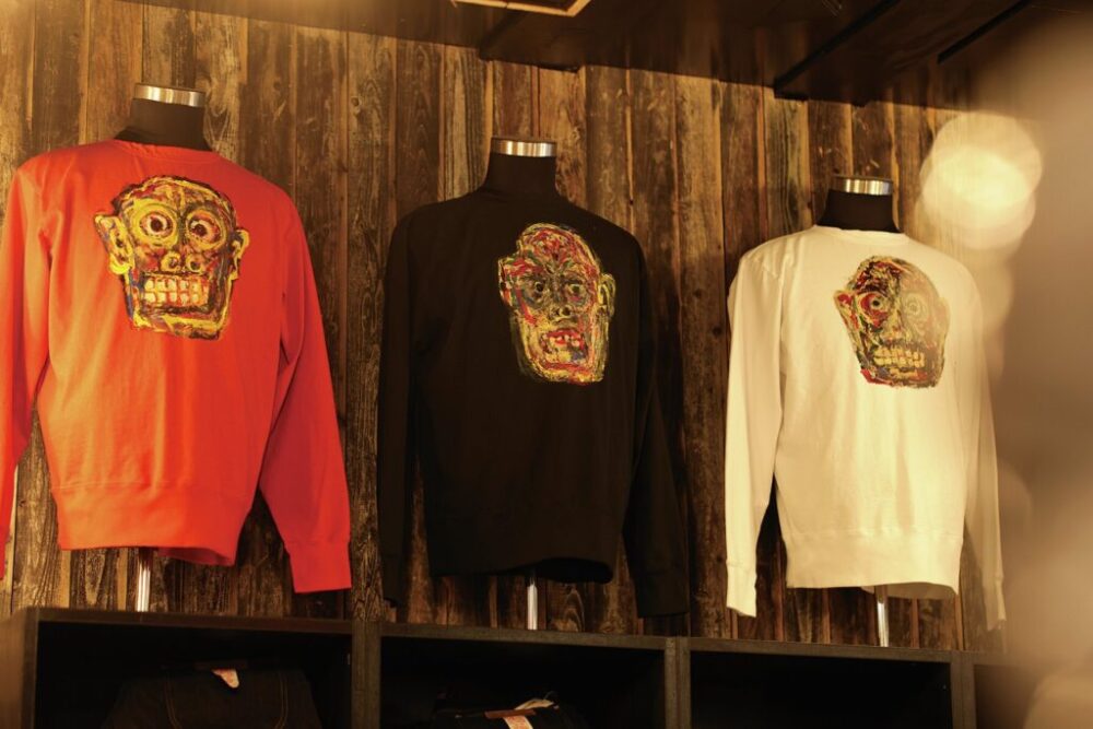 オープン以来、目玉となっているのは山根氏がペンキで描くアートTだ。なかでも人の顔を描いた「怖いおっちゃん」シリーズは、独創的な色合いと表情が強烈なインパクトを放つ。しかしどこかで見たことのあるような親近感の湧くイラストは彼の作風なのだ。