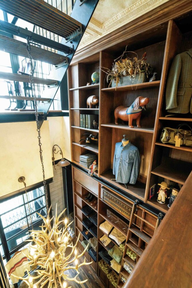 まず店内に入るなり目に入るのは高い天井。吹き抜けを利用し、壁一面がディスプレイ専用棚として機能する。また第一次世界大戦時に使われていた海軍のハシゴが店内のインテリアとして大きな存在感を発揮し、空間を彩るアートピースとなっている。