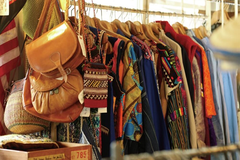 アジアやメキシコなどヴィンテージの民族衣装、民藝品的なウエアがハンギングされたラック。コーディネイトのアクセントにグッド。