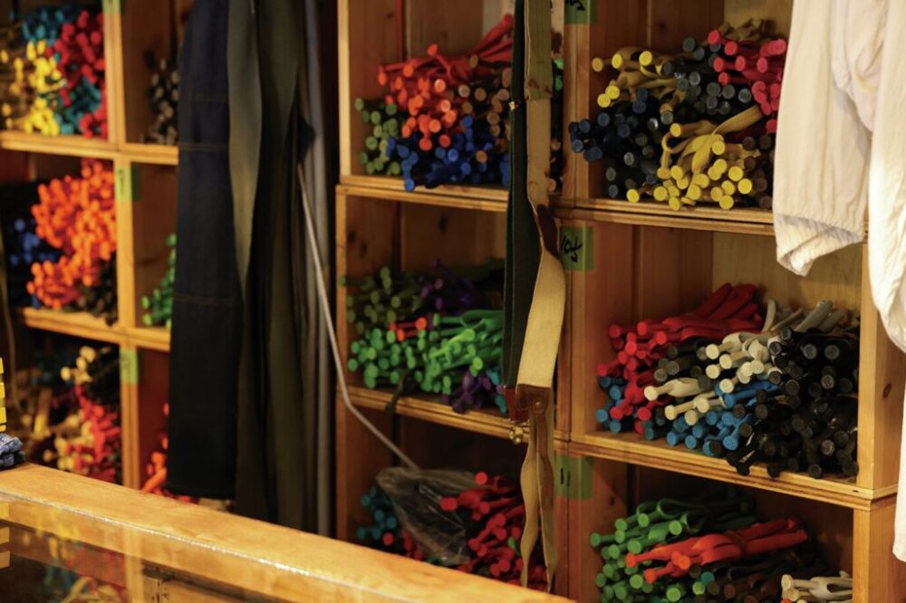 ビーチサンダル専門ブランドのB-sanの直営店としての機能も果たしているため、常にパーツの在庫は常備してある。写真は鼻緒。