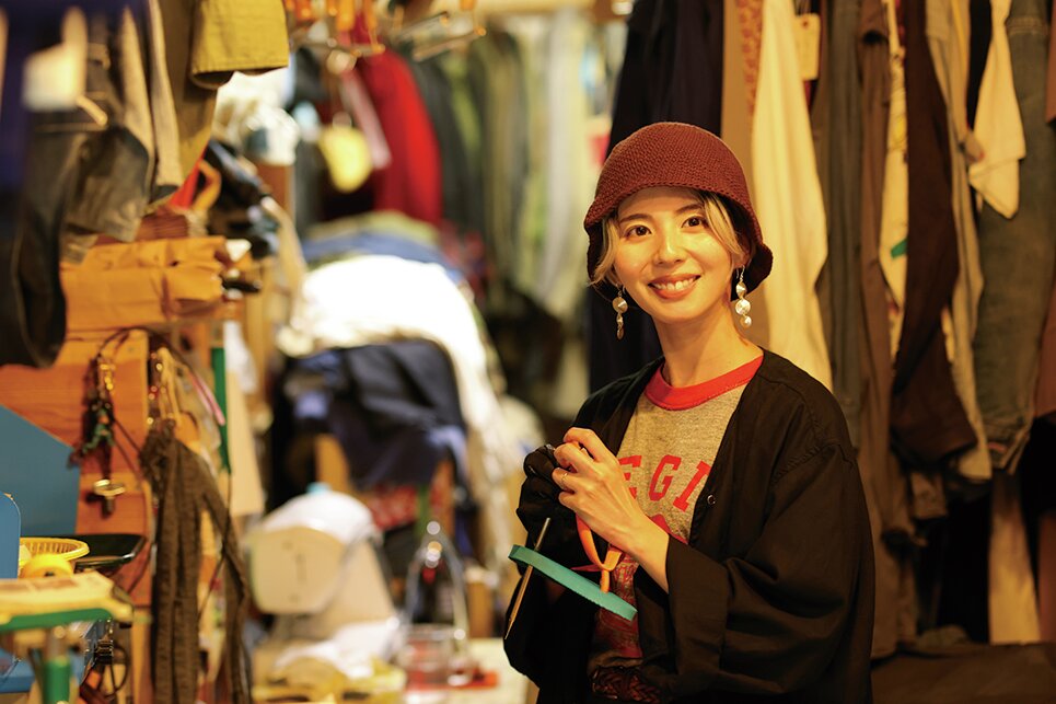 ショップの看板娘として店頭に立つ薮由衣さん。コーディネイトのアドバイスはもちろん、B-sanのカスタムメイドも担当する。