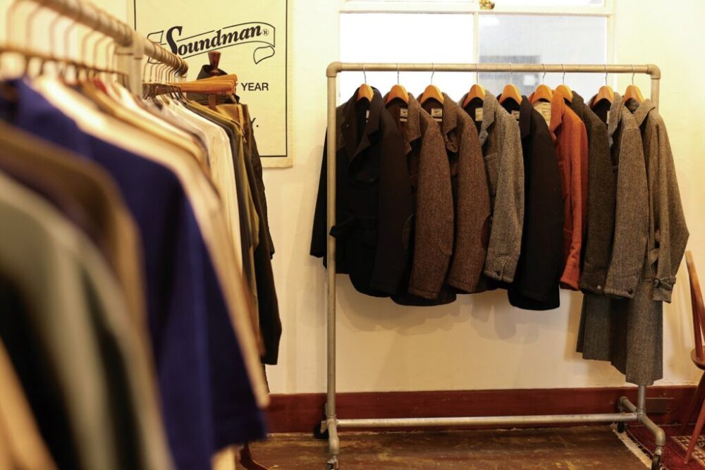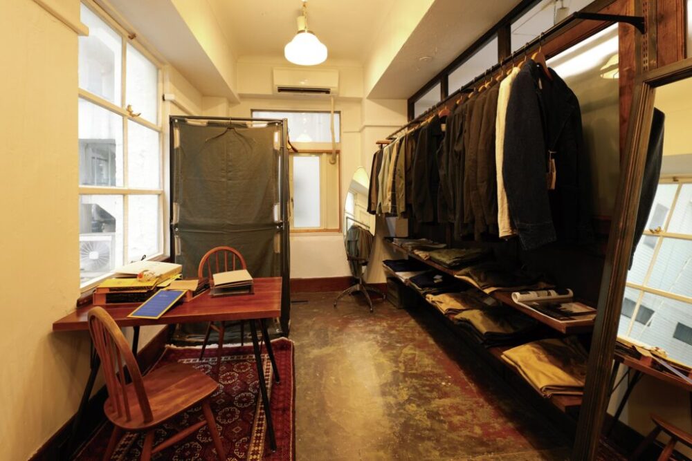 ヴィンテージのワークやミリタリーからインスピレーションを受けコレクションを展開するSoundman。どこか上品かつスタイリッシュな印象を受けるのは、主に英国ヴィンテージをモチーフとしているから。基本的に205号室はディレクターの今井氏がオフィスとして活用しているものの、土曜日のみウィークエンドストアとして一般開放している。