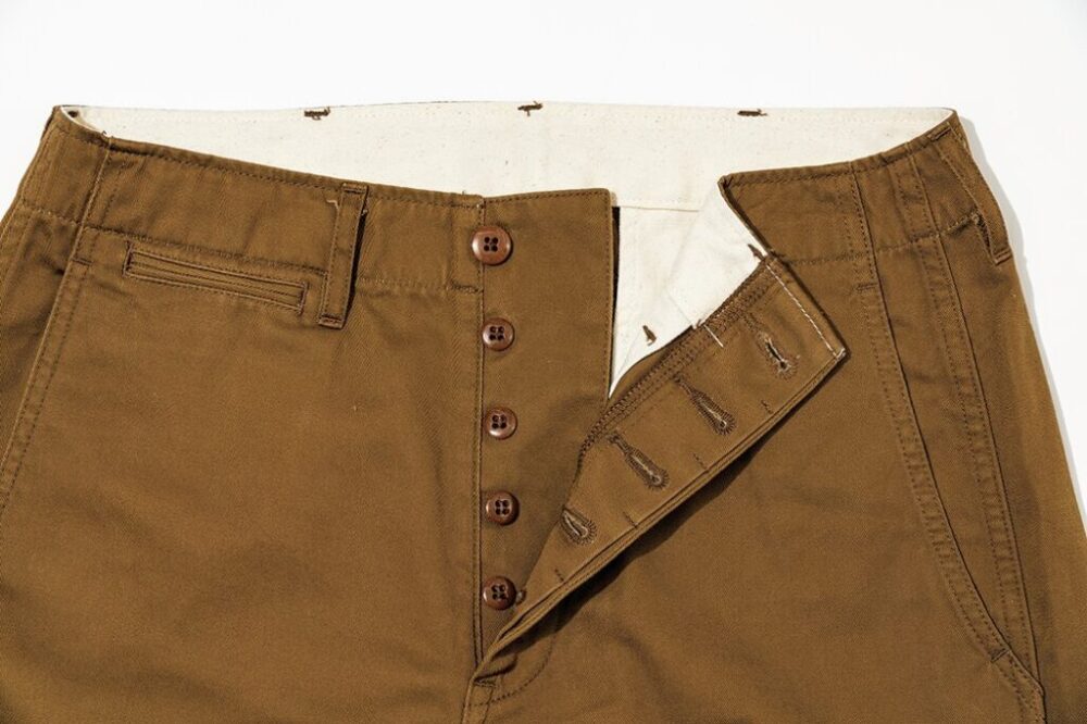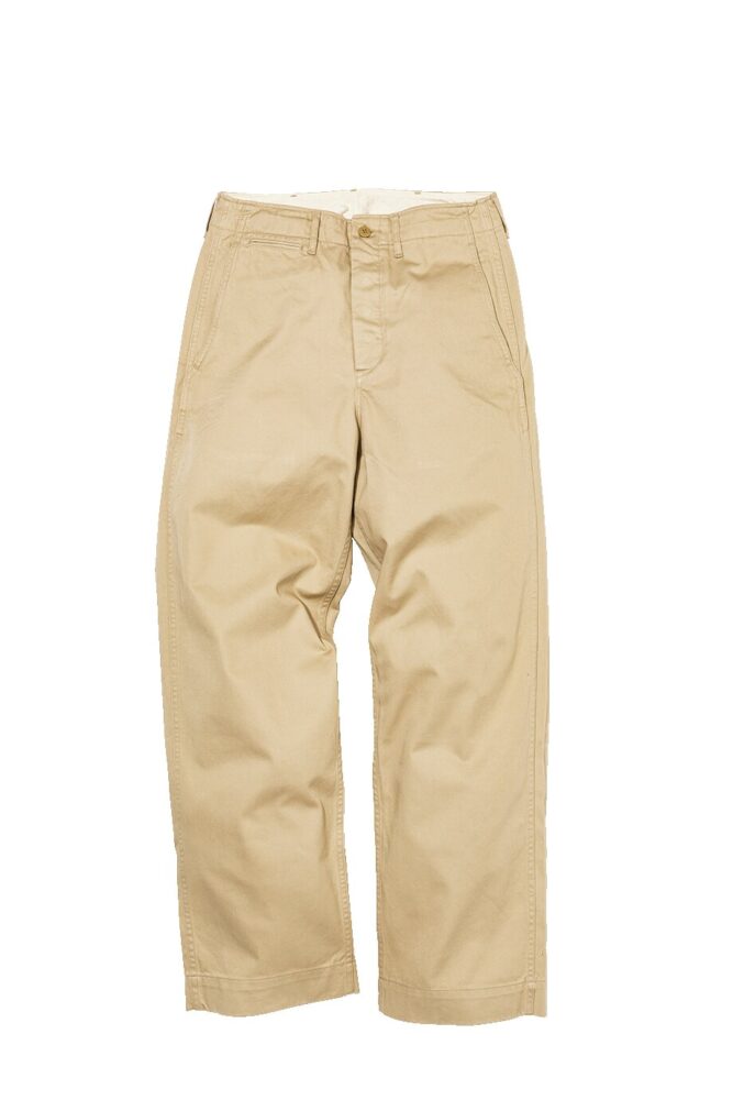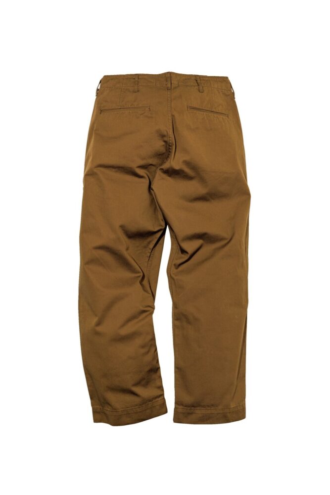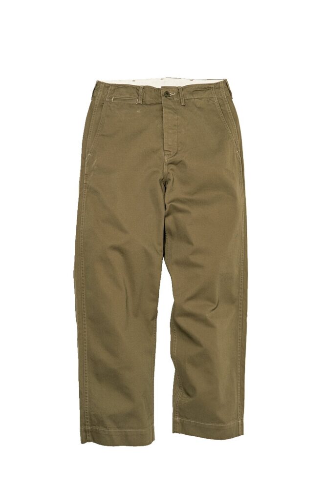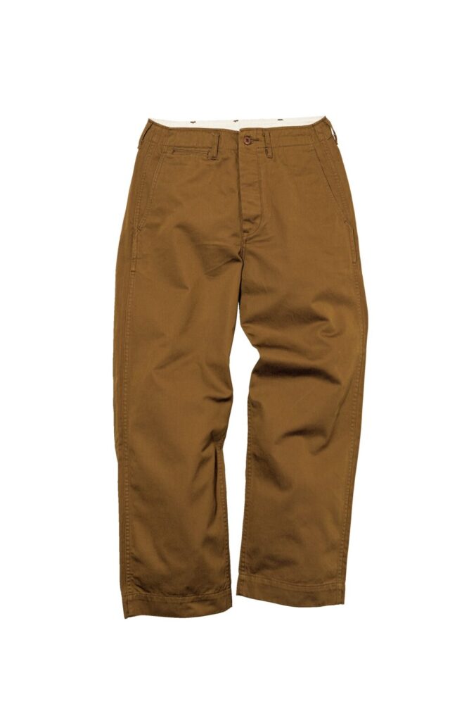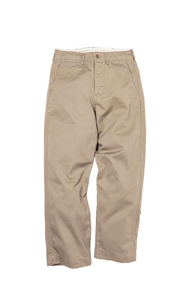 それまでのトラウザーズは乗馬パンツ型(ジョッパーパンツ)であったが、現在のパンツに近いデザインへと進化。股上が深く、ゆったりとした太めのシルエットが特徴だ。これはシャツと共に夏季用の制服兼戦闘服として第二次世界大戦初期に熱帯地帯にて使用され、その後、通称“43カーキ” や“45カーキ” といったディテールや縫製仕様が変更されたモデルへと移り変わっていく。