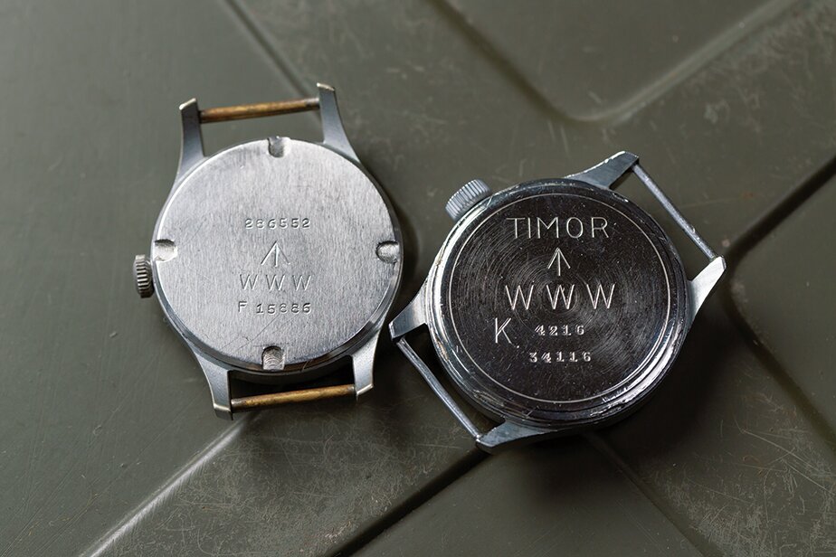12社の時計メーカーが納入したW.W.W.シリーズとは、Wrist Watch Waterproofの頭文字から取ったもの。支給されたのが40年代の終戦間近だったことから、50年代になっても一部は、文字盤を交換して使用