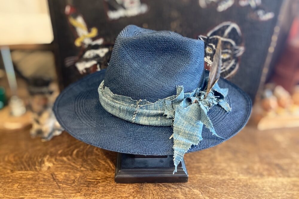名前の無い人という意味のJOHN DOEは自由な発想で作られるモデル。これはインディゴカラーの帽体に、リボンにはアフリカ、ブルキナファソ産のインディゴ染めの生地を使っている。パナマハットでもカラーを楽しみたい人向けの好デザイン。5万7200円