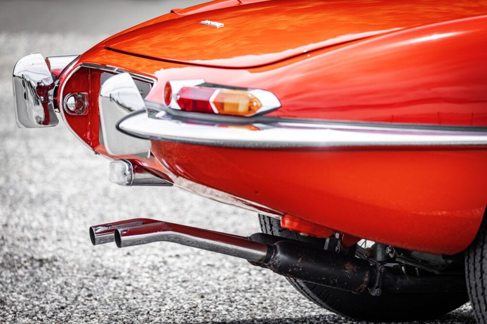 センターから伸び、ボディに沿ってやや跳ね上がる形状のマフラーはEタイプを象徴するデザインでもある。