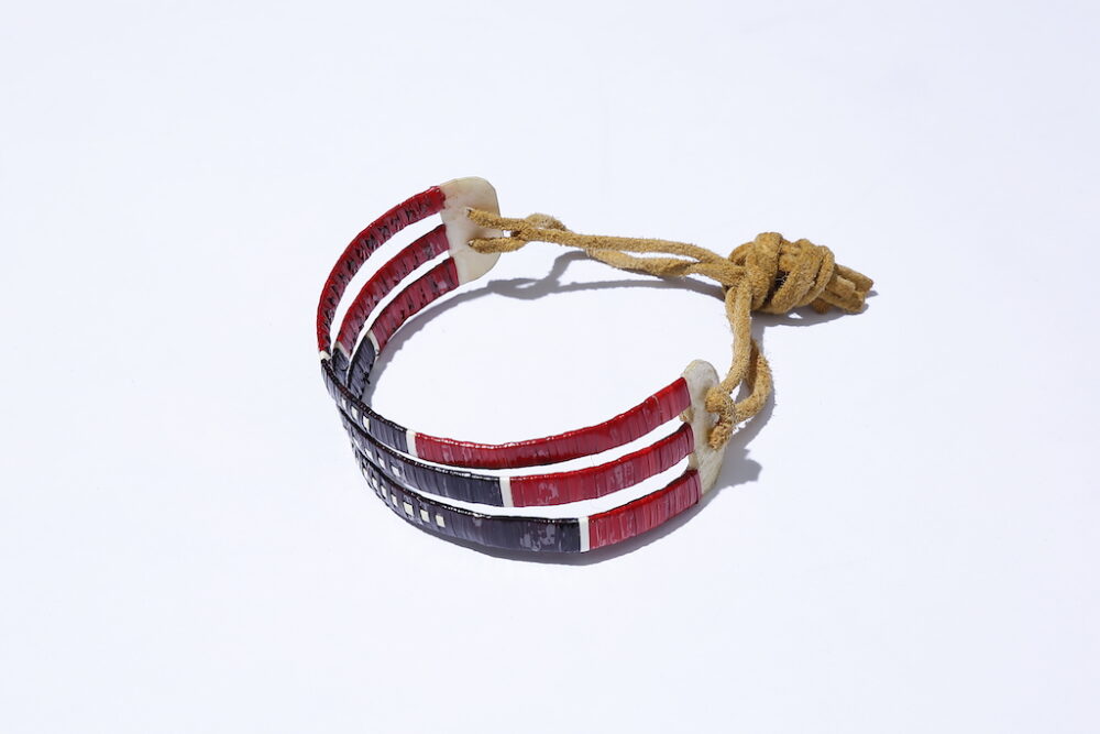 親交のあった故アル・ソマーズといっ しょにアルバカーキに行ったときに、彼の親族であるネイティブ・アメリカンが作ってくれたバングル。ヤマアラシの針を抜いて、手作業でフラットにし、天然染料で染色するという伝統的な技法によるものながら、ファッション性も非常に高い。アルとの思い出のひとつとして大切に持っている。