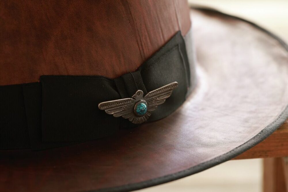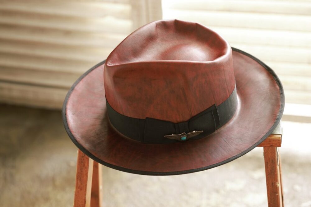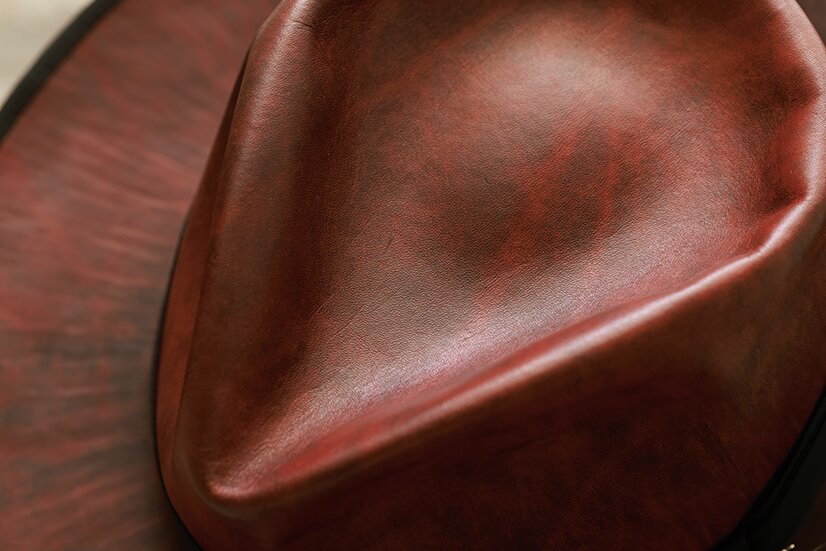 レザークラフトとハットメイキングの技術を駆使して一枚革を型入れしている。手染めでムラ染めにしているので色が濃く入る箇所がある。