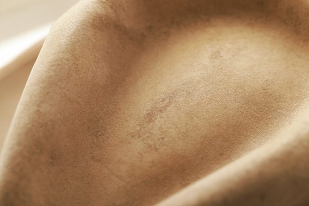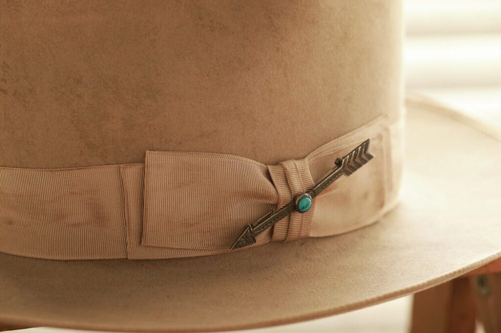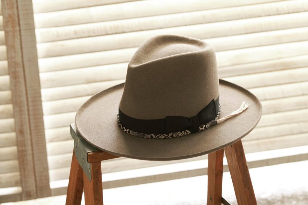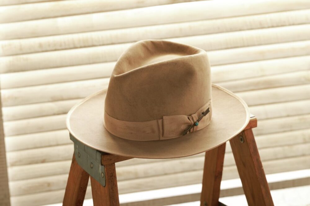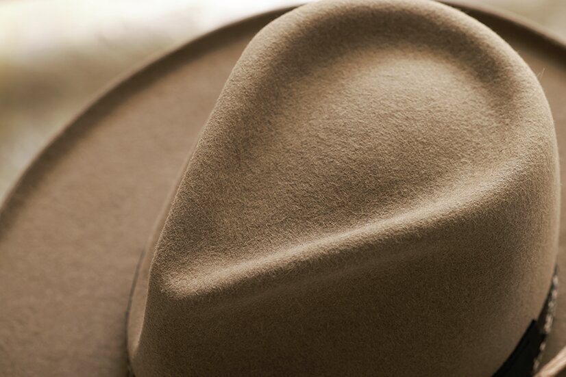 最高級フェルトハットの素材として知られているポルトガルビーバーフェルトを使用。独自の加工を施し、ビンテージのようなぬめりのある質感に仕上がっている。