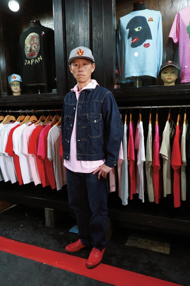 新作の革靴は、かつてイギリス軍靴を製造していたインドのファクトリー製のもの(¥39,600)。いずれのショップも新たな看板アイテムとして徐々に浸透し始めているペンキで描く、アート性の高い手描きTシャツもセレクト。タイミング次第では、彼が描くアートTシャツのレアな製作現場に遭遇するかも!?