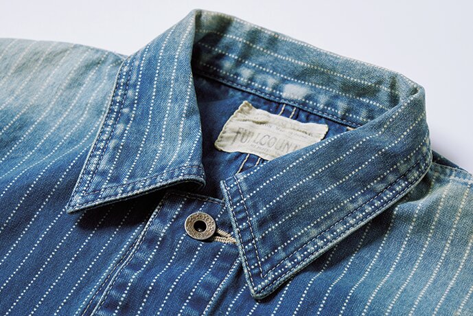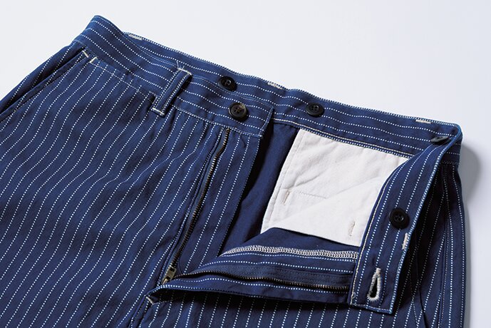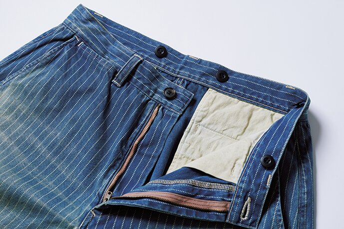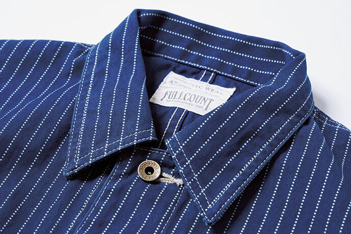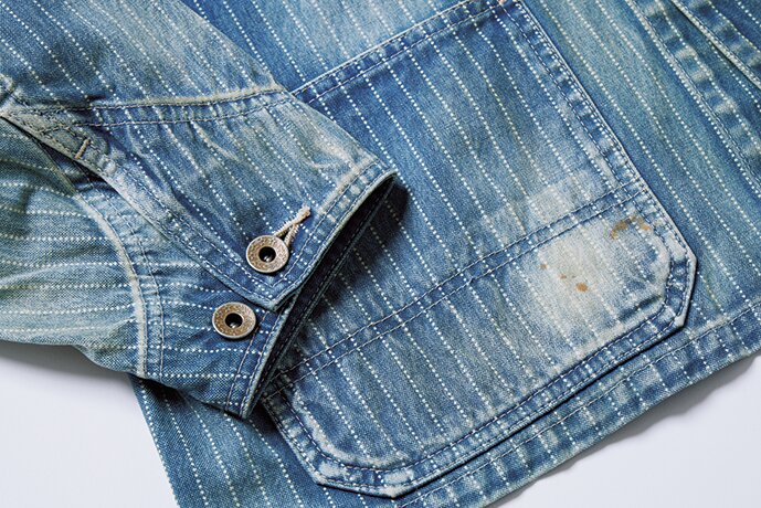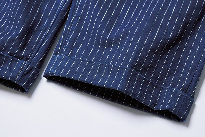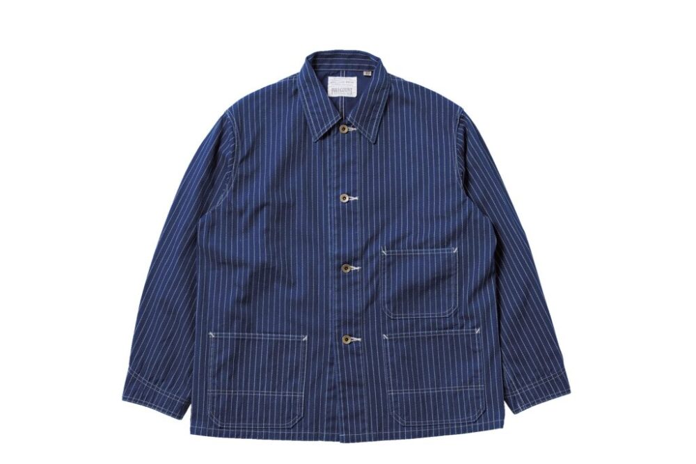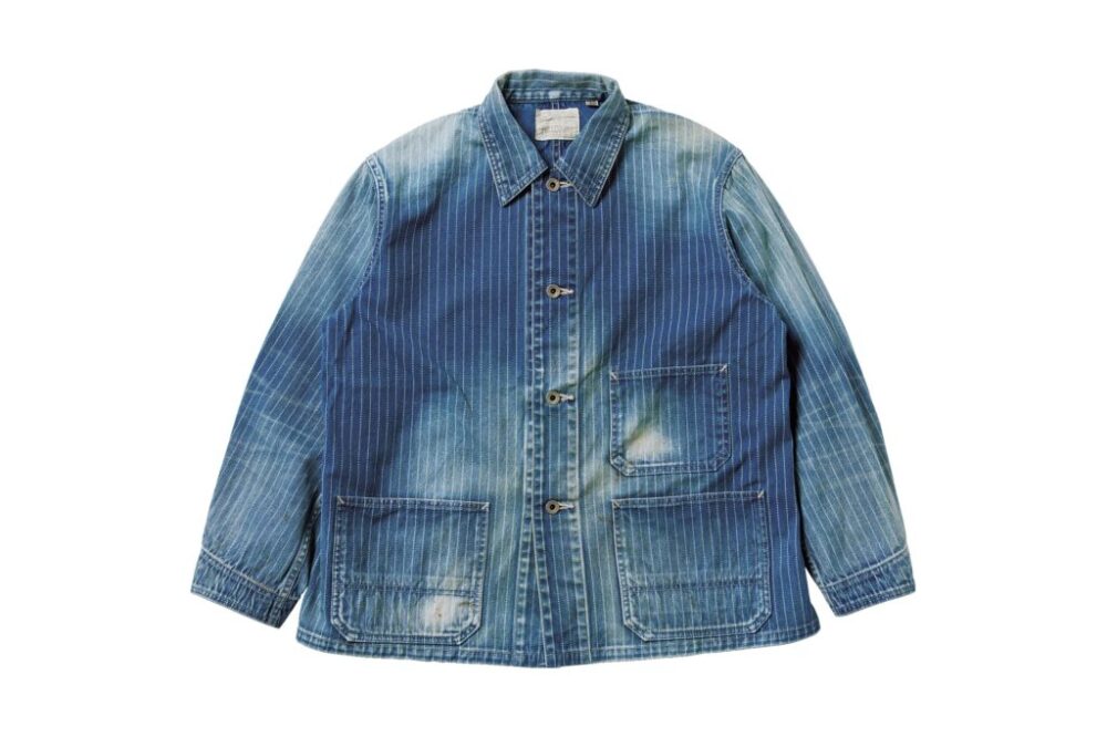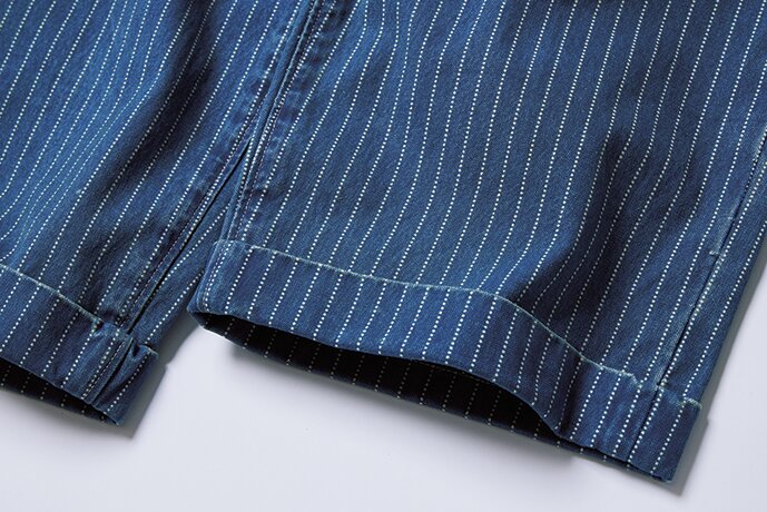 これらアイテムの特徴はインディゴ染めしたダック素材に20世紀初頭に流行したウォバッシュという手法(抜染)でドット調ストライプ柄に仕上げた素材を使用しており、ワンウォッシュとハンドウォッシュという2つの加工と、チョアジャケットとファーマーズトラウザーズのセットアップでの展開となっている。