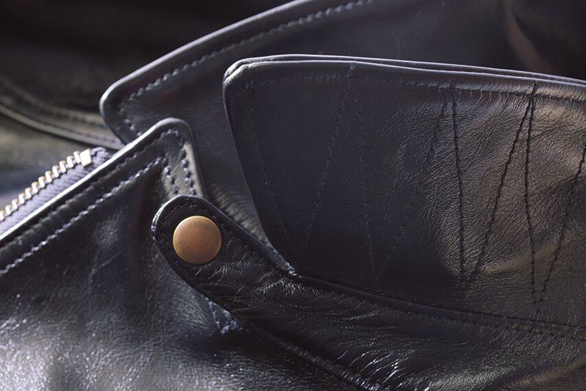 ヴィンテージモーターサイクルジャケットをベースにデザインを再構築した逸品。きめ細かく、艶やかで滑らかな上質なホースハイドをマテリアルに使用した新作レザージャケットは、どこかクラシカルな佇まいがレザーファンを魅了する。オフセットされたフロントファスナーにフロントのフラップ付きポケット、さらに背面に見られる独特なカッティングがこのモデルの大きな特徴だ。187,000円