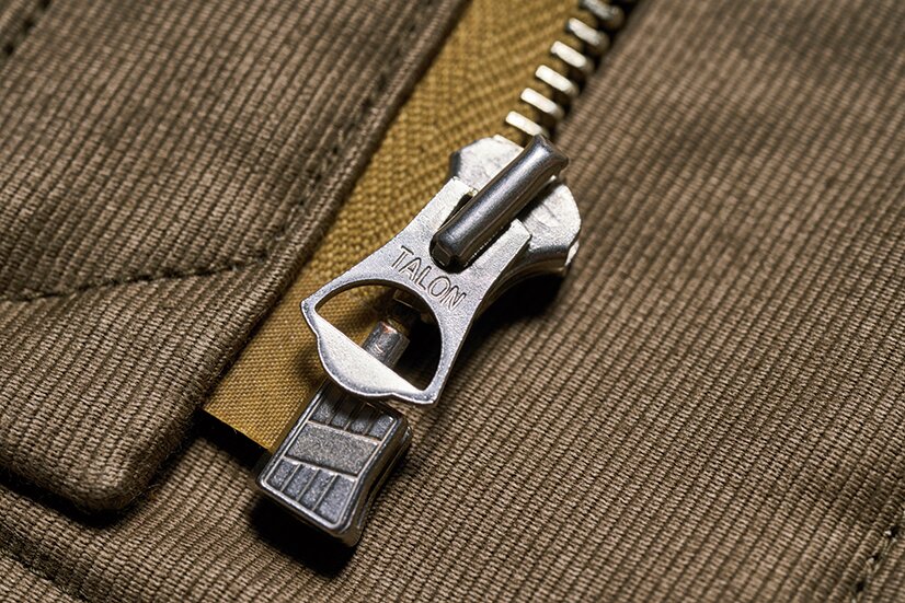 ’40年代らしいベル型TALONジッパーを装備。俗にデコTALONと呼ぶエンドピースが付く。