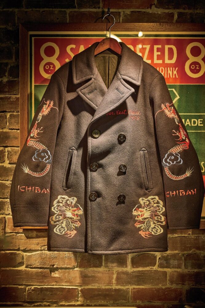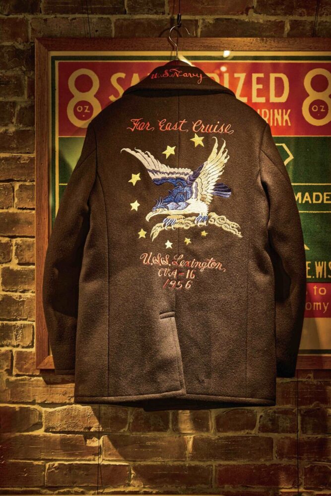 1900年代初頭から現在までほぼ変わらぬ外見を持ち、米海軍下士官からも絶大な支持を得ているピーコート。こちらは米海軍航空母艦CVA-16レキシントンの乗員が、1956年に極東航海をした際、寄港した横須賀基地にあるネイビーエクスチェンジ内のテーラーにて個性豊かなスカ刺繍を施したモデル。オリエンタルな表情は要注目だ。93,500円