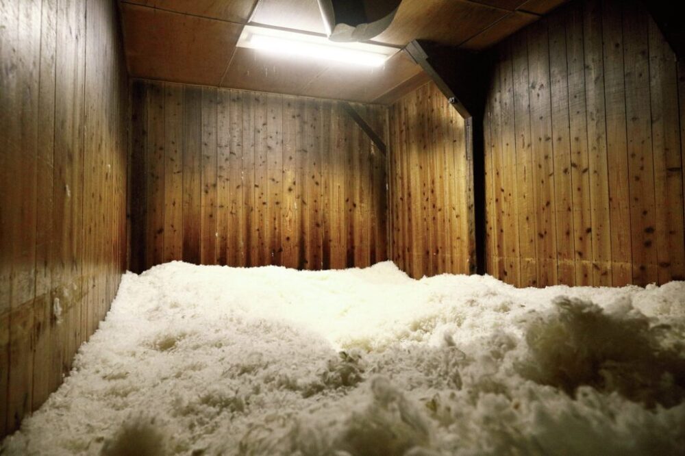 ウールができるまでの工程は、主に4つに分かれている。羊毛を選別し均一にブレンドしながら開毛、調合油を添加する「調合」、調合された羊毛をローラーで回しながらムラのないミルフィーユ状の毛膜をつくり、「篠」と呼ばれる繊維の束にする「カード」、「篠」にミュール精紡機で撚りを入れて糸にする「精紡」、ミュールからあがった糸を織りや編みがしやすいように1㎏ほどの大きさに巻き替える「ワインダー」だ。