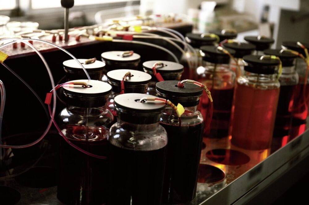 次は紡績された糸を染め上げる「染色」の工程。糸の質感を損なわず、絶妙な色出しを行うことは非常に難しく、高い技術力が要求される。まずおこなうのは色の調合。幾数もの染料をまずは小さなビーカーで調合し実際に糸を染め上げる作業を何度も繰り返すところからはじまる。