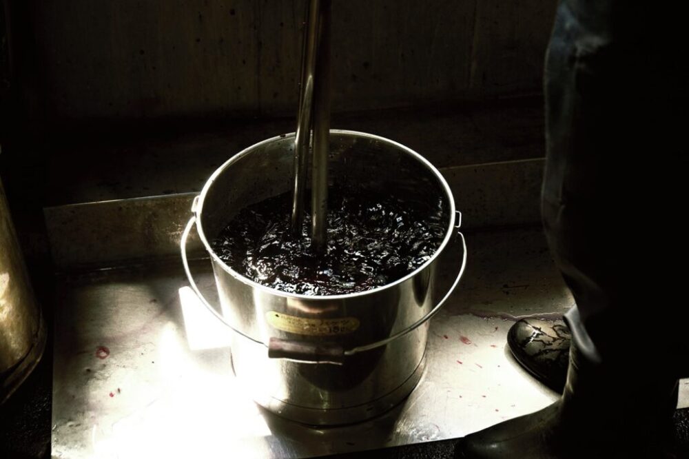 色の調合・調整が終わった後、いよいよ大量の糸を染色する工程にうつるわけだが、ビーカーでおこなった調合をその数十、数百倍でおこなうのも至難の業なのだとか。その日その場所の気温、湿度によって色味が変わってしまうだけにここに職人の経験値が存分にいかされるのだ。