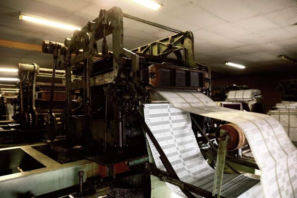 ちなみに、たとえこの織機があったとしても、このセッティング作業ができる人が日本にほぼいないとのこと。糸の組付けが終わった後はジャカード織機の最大の特徴ともいえる「紋紙」をセットする。ただ再現する柄や色数によっても設備が変わるため、何処でも同じものが織れるとは限らない。